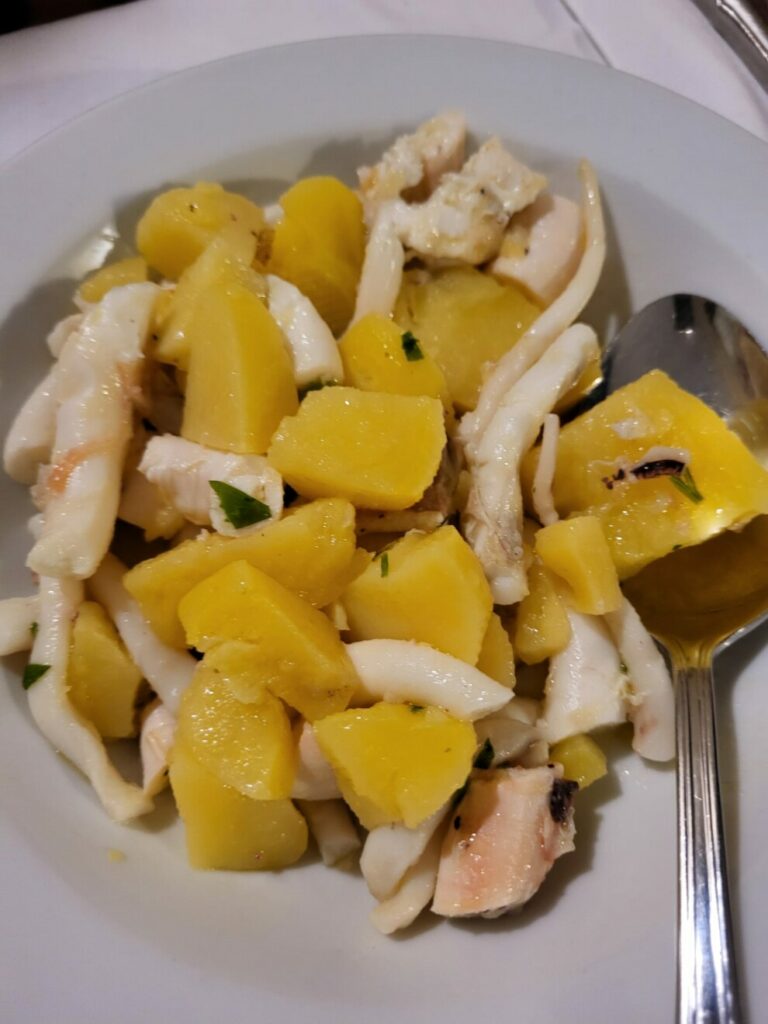 In effetti abbiamo mangiato davvero bene. Il locale è semplice negli arredamenti ed anche il servizio è molto cortese e a gestione familiare: non abbiamo scelto da un menù scritto, il cameriere ci ha raccontato i piatti del giorno e tra questi, optando quasi tutti per il pesce, abbiamo preso un antipasto misto molto buono, con pepata di cozze, moscardini fritti, alici sott’olio, insalata di mare, polipo e patate etc…; come primi abbiamo preso una mezza porzione di lasagna per i bimbi (che in realtà era più grande di una porzione intera!), dei tonnarelli allo scoglio e dei paccheri spigola e pachino. Primi veramente buonissimi, innaffiati con un ottimo vino bianco imbottigliato a nome del locale!